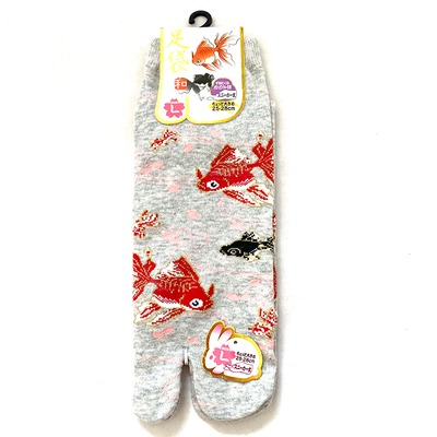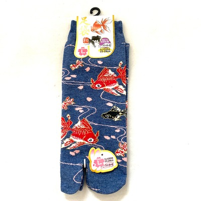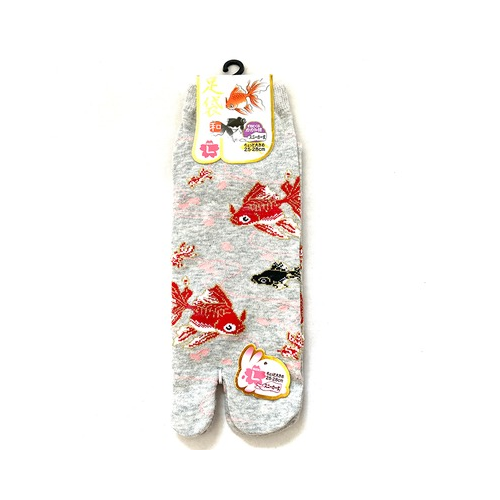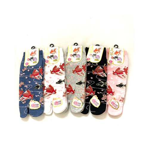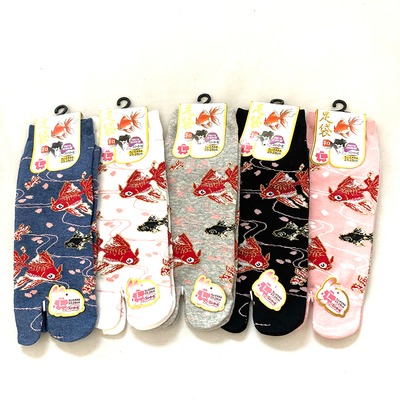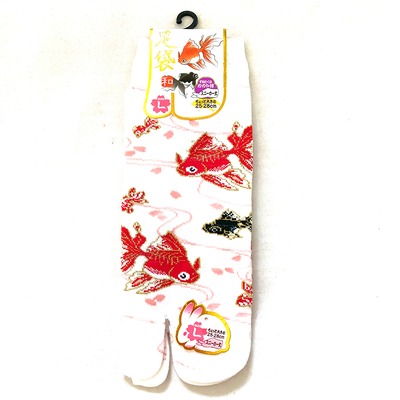 These Tabi socks feature a traditional Japanese design. The beautiful goldfish pattern is intricately detailed, showcasing the elegance of red and black goldfish swimming gracefully. The design also includes flower petals floating on the water's surface and wave patterns, adding a sense of movement and charm.